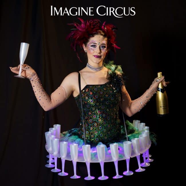 Strolling Champagne Girl, Fancy Drink Service, Red Rose Dress, Kaci, Imagine Circus Performer, Photo by Finding Future
