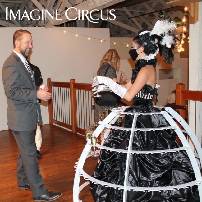 Our Champagne Dress holds up to 108 champagne flutes, wine glasses or stemmed cocktails. Our Champagne Dress servers make a great first impression as guests arrive and are an entertaining addition to cocktail hours. Our strolling Champagne Dress complements any event theme with custom costuming and matching accessories. Recommended for larger parties and bigger spaces.
