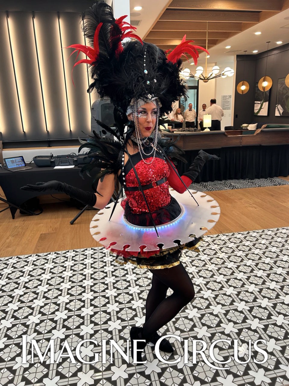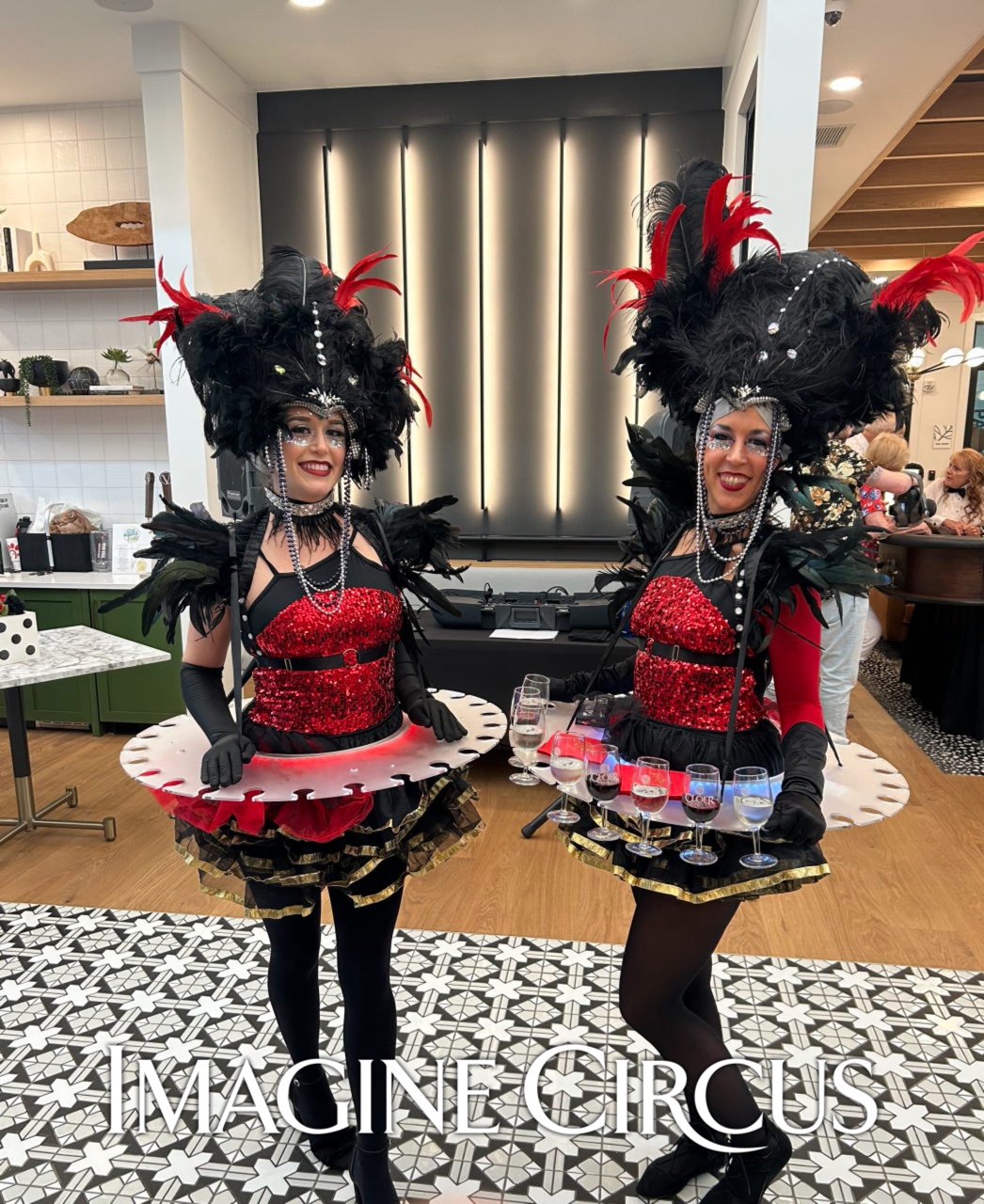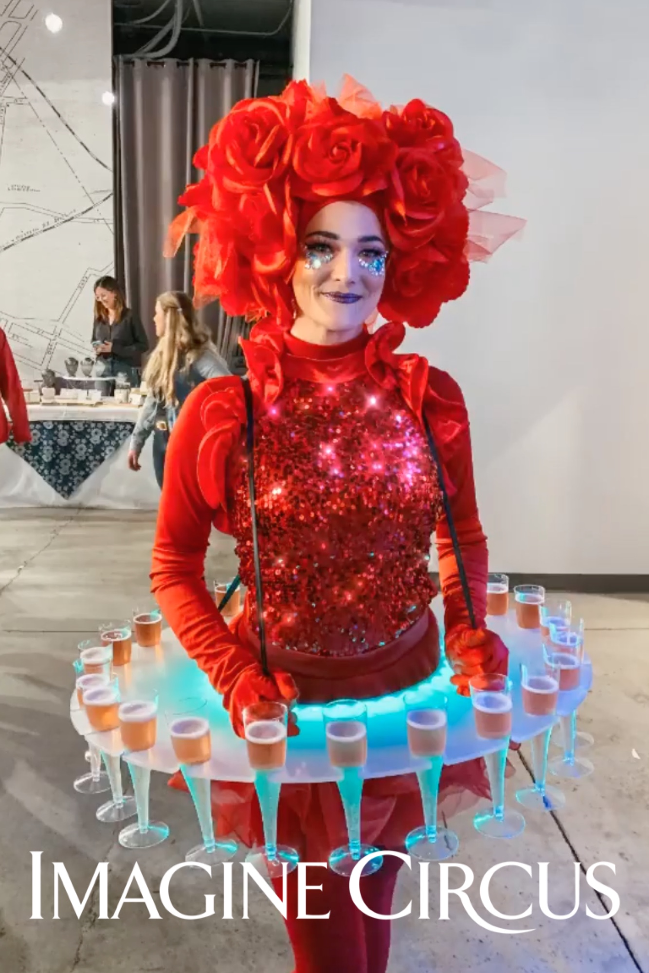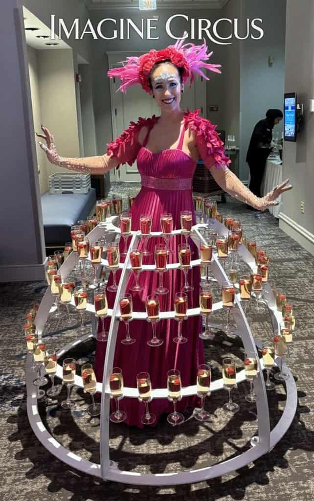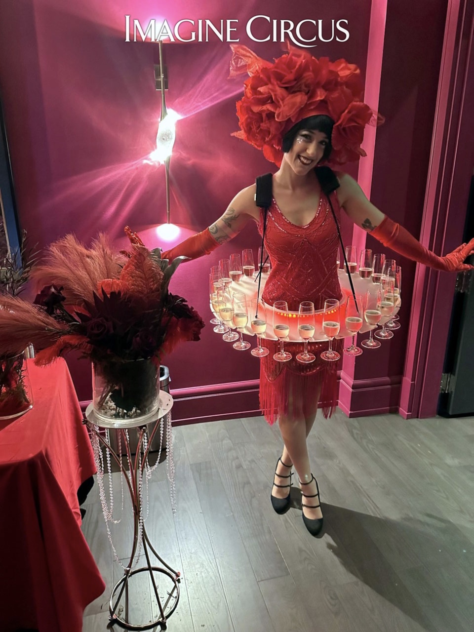 Strolling Champagne Girl, Fancy Drink Service, Red Rose Dress, Kaci, Imagine Circus Performer, Photo by Finding Future