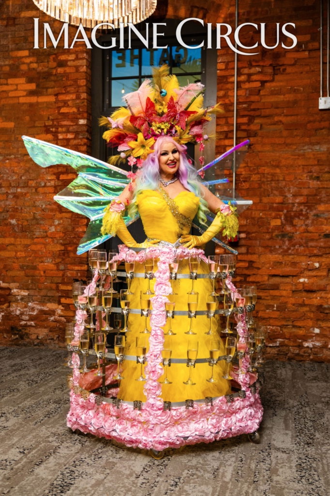 Our Strolling Champagne Dress complements any event theme with custom costuming and matching accessories, while our LED Drink Skirt can illuminate in the color that matches your event decor. Each skirt can hold a wide variety of beverages served in stemmed glasses!