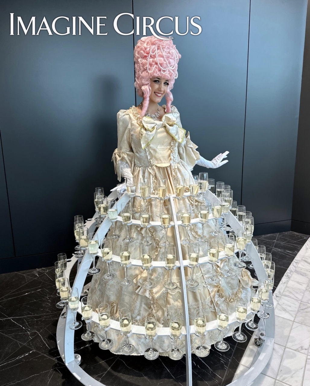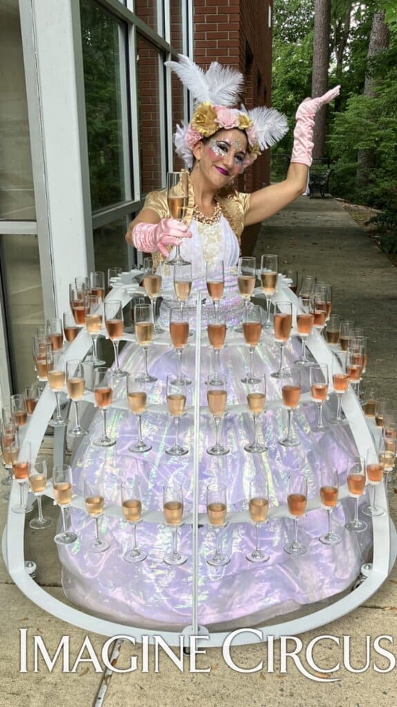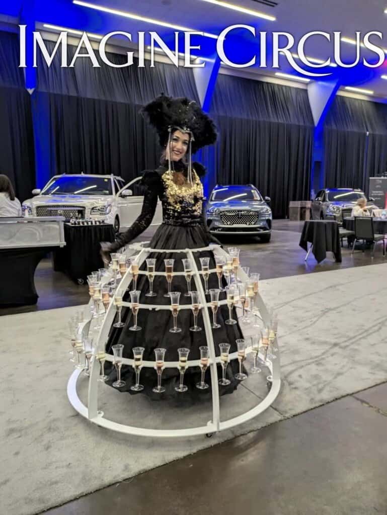 Our Champagne Dress holds up to 108 champagne flutes, wine glasses or stemmed cocktails. Our Champagne Dress servers make a great first impression as guests arrive and are an entertaining addition to cocktail hours. Our strolling Champagne Dress complements any event theme with custom costuming and matching accessories. Recommended for larger parties and bigger spaces.