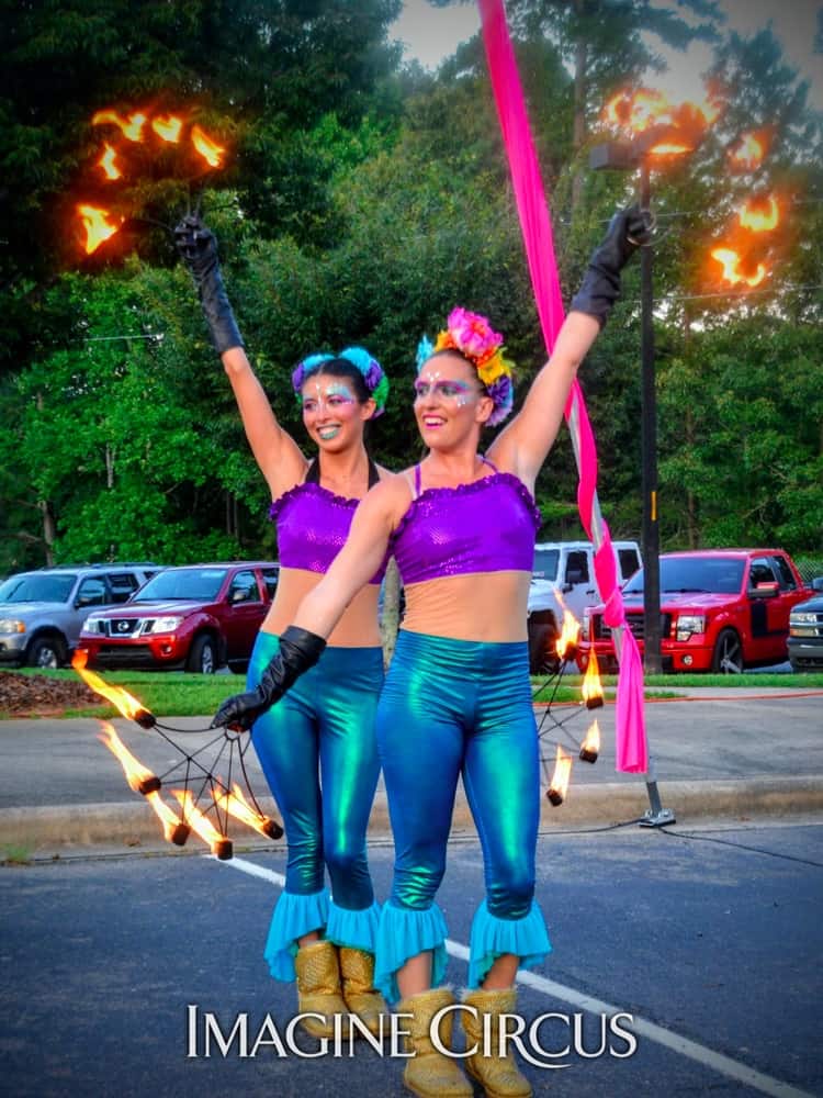 Our aerial dancers can be transformed into beautiful mermaids, our jugglers can wear silly clownfish costumes, our larger-than-life stilt walkers can double as gorgeous glowing jellyfish, and any of our circus acts can be dressed in oceanic colors–like hues of blue, teal, green, coral, and glittery metallic accents!